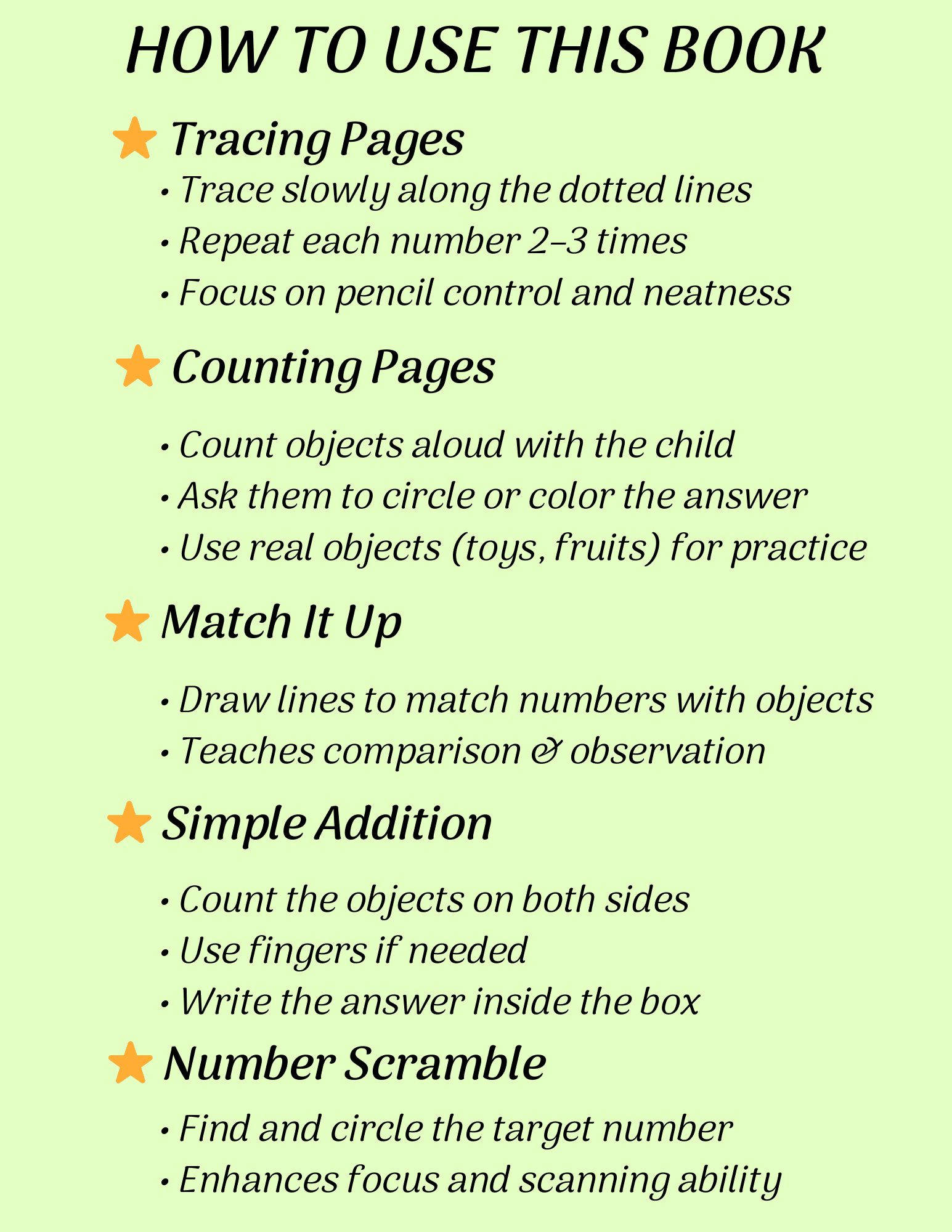 Each activity page is designed to keep children engaged while improving their number recognition, problem-solving skills, and hand-eye coordination. The workbook uses simple visual examples that help children understand numbers in a playful and easy way.
